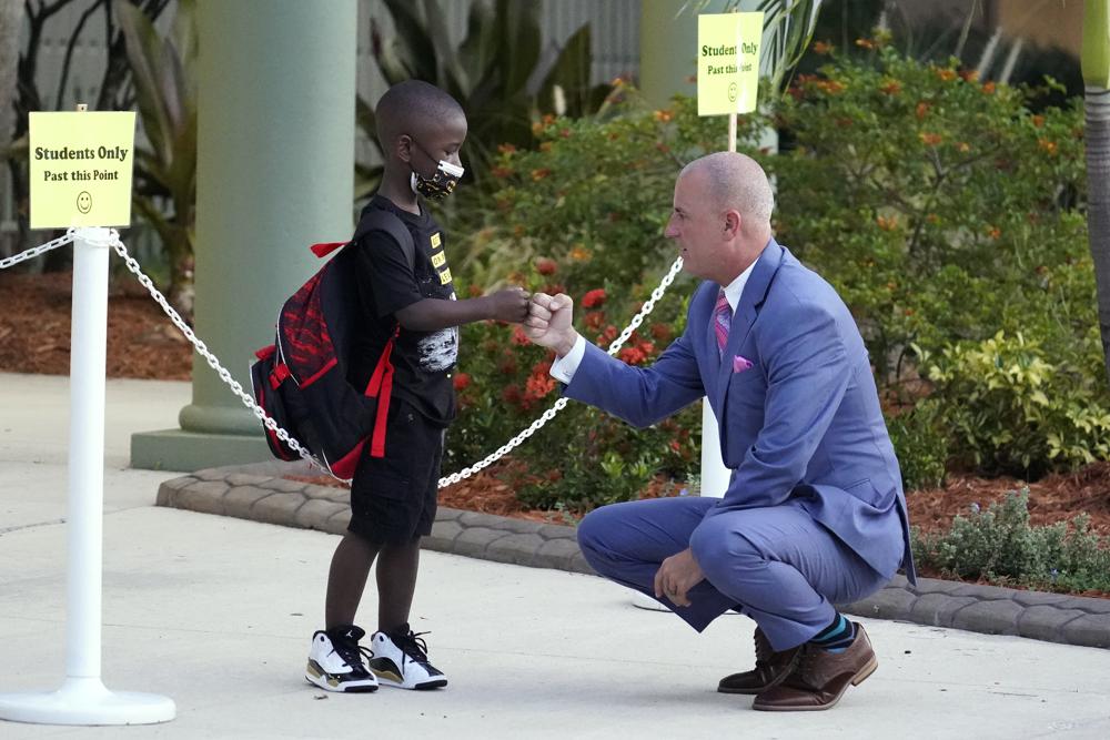 Addison Davis, Hillsborough County Superintendent of Schools, right, fist bumps student James Braden before he heads to class on the first day of school at Sessums Elementary School Tuesday, Aug. 10, 2021, in Riverview, Fla. (AP Photo/Chris O’Meara)