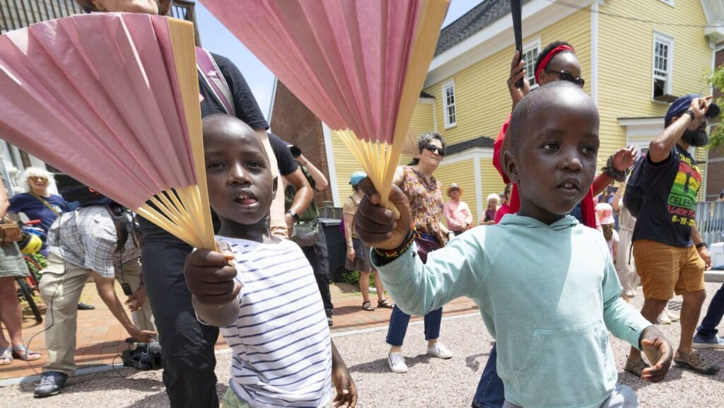 FILE – Levis Martin, left, and his brother Daniel dance with fans during a Juneteenth celebration in Portsmouth, N.H, on June 19, 2025. (AP Photo/Michael…