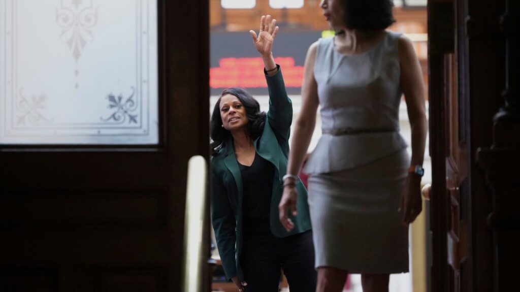 Texas state Rep. Nicole Collier, left, waves past Texas state Sen. Carol Alvarado, right, to supporters outside of the House Chamber where she refuses to…